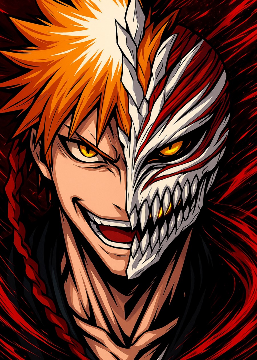 A powerful illustration of Ichigo Kurosaki from Bleach, showcasing his dual nature as a Soul Reaper and his fearsome Hollow form.