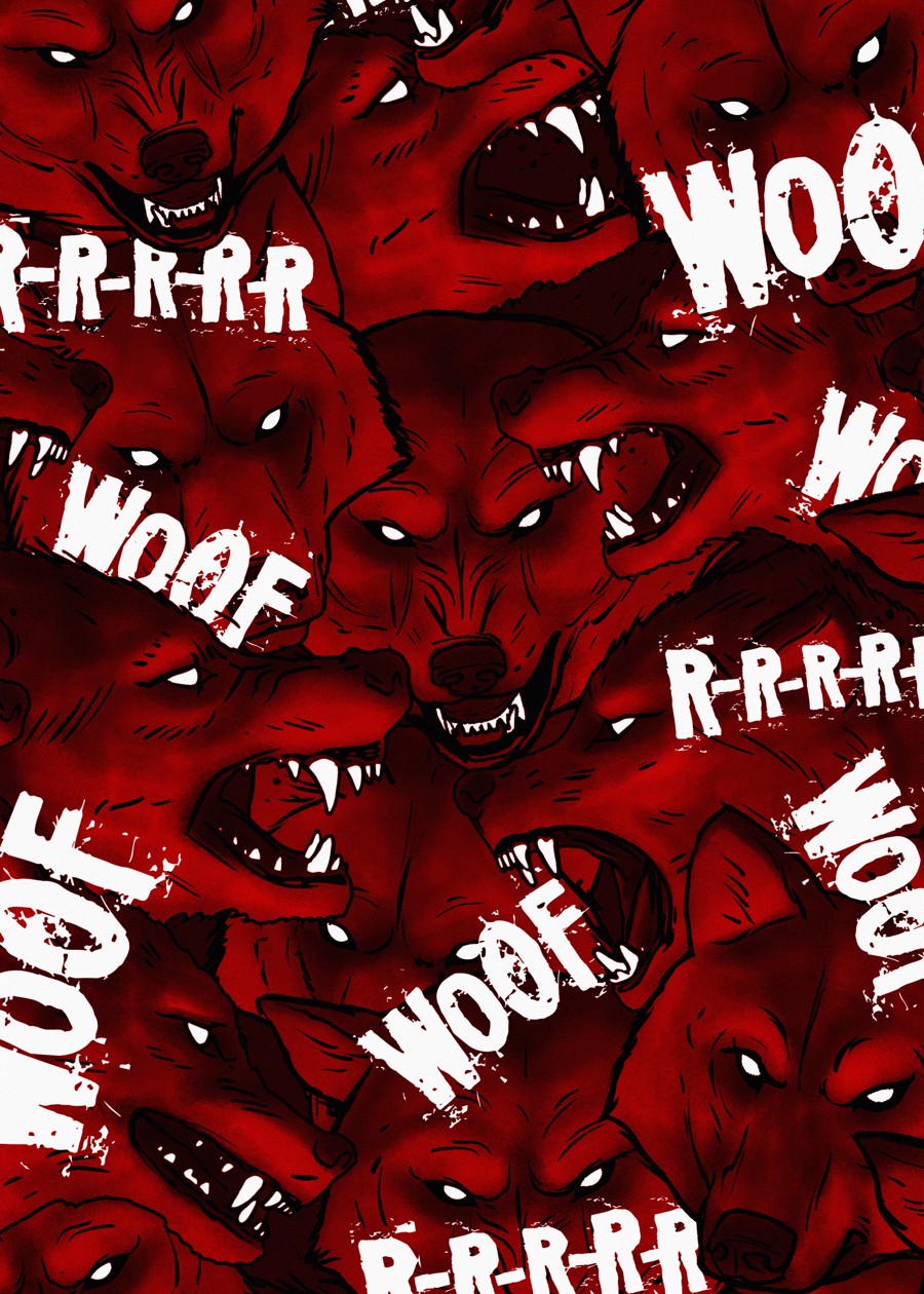 A chaotic, high-contrast red background with aggressive wolves howling, interspersed with the words "WOOF" and "R-R-R-R." Pure rage.