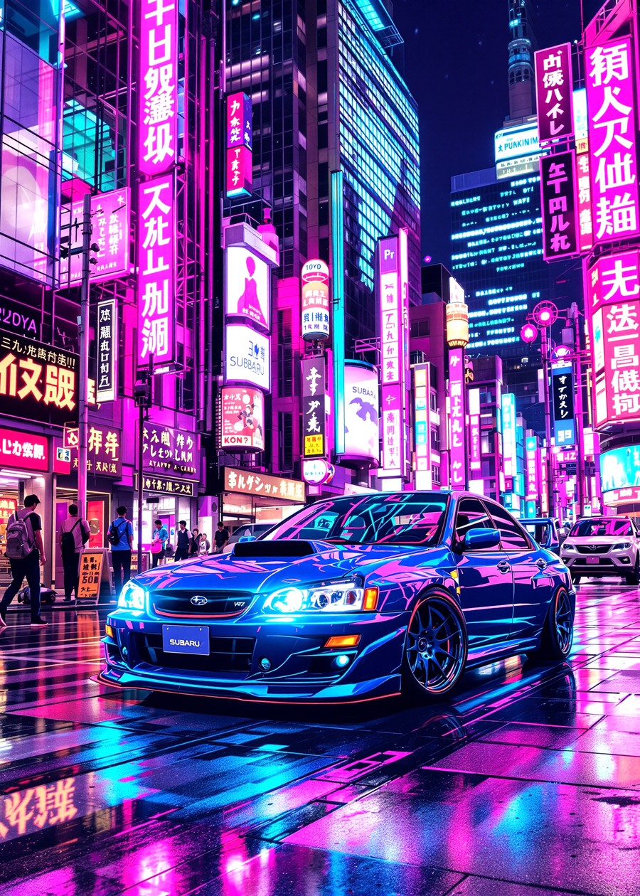 A vibrant blue Nissan GT-R (R34) parked or driving slowly down a neon-lit cyberpunk alleyway