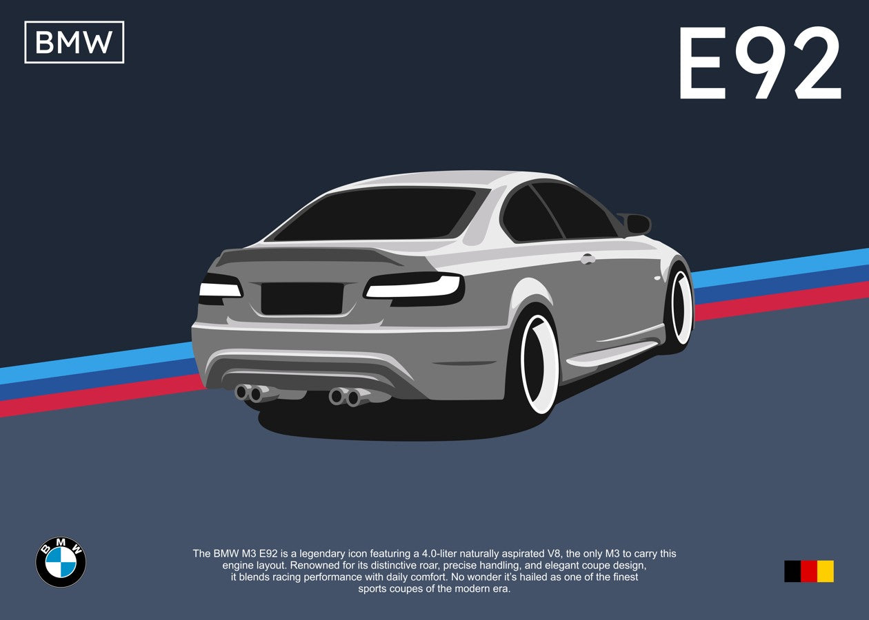 The BMW E92 features sporty coupe styling and dynamic driving character, making it one of the most loved 3-Series generations by enthusiasts