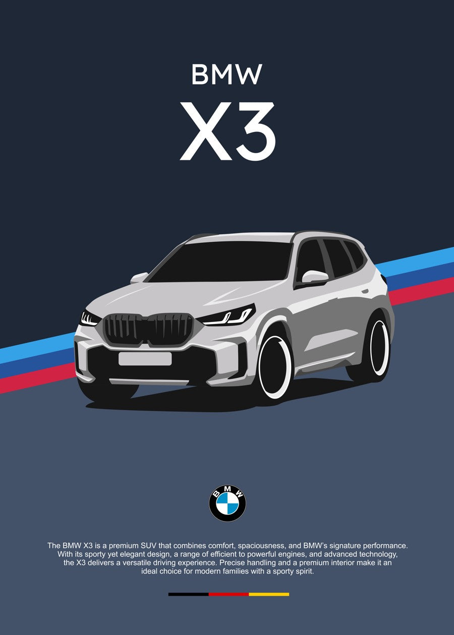 The BMW X3 is an elegant SUV with efficient performance and modern design, combining comfort, practicality, and premium German style.