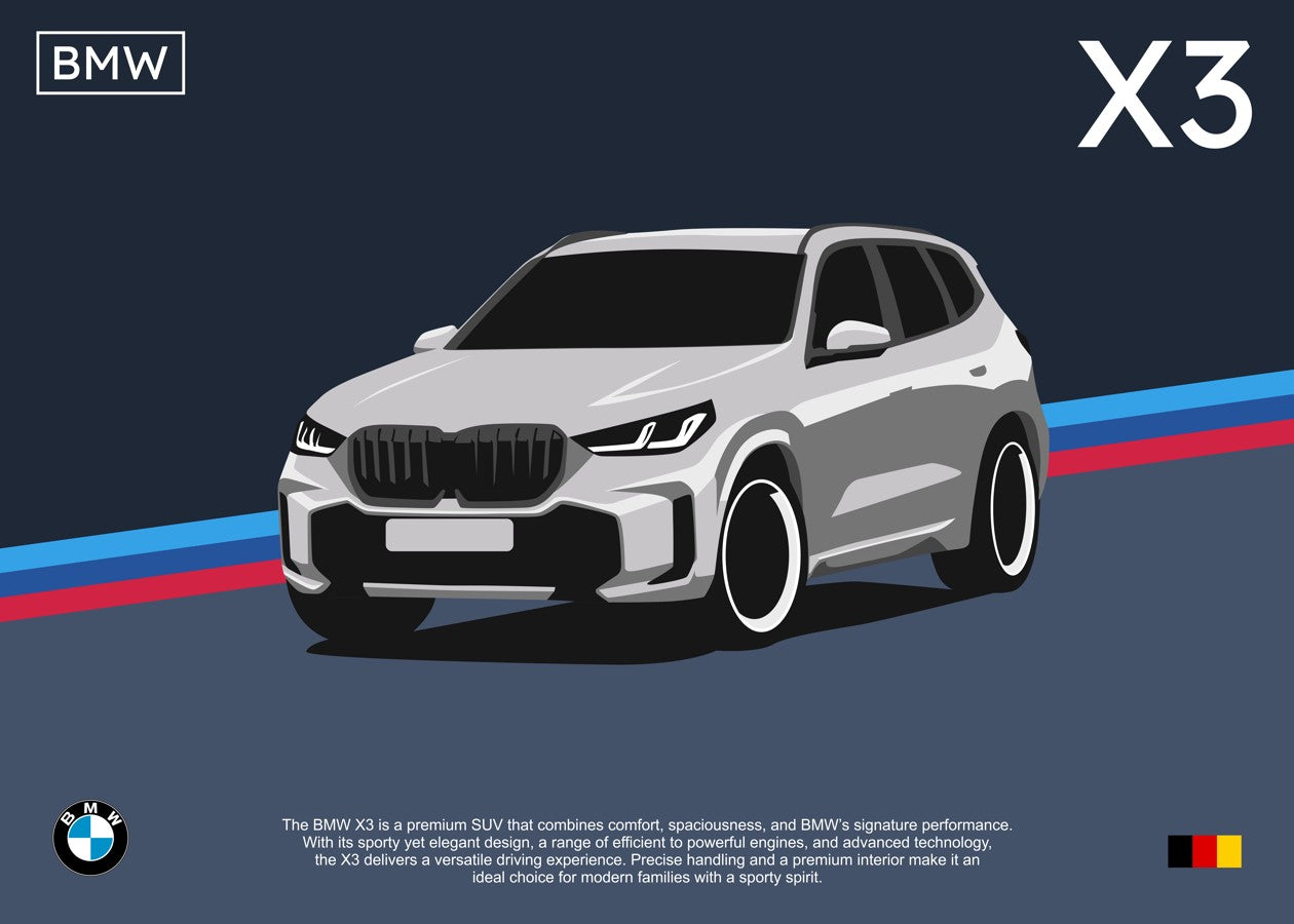 The BMW X3 is a premium SUV with high comfort and sporty handling, making it an ideal choice for active lifestyles and daily driving.