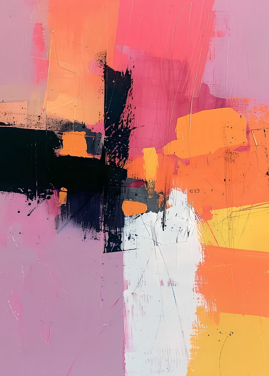 A striking blend of bold pink, orange, black and white brushstrokes in modern abstract composition.