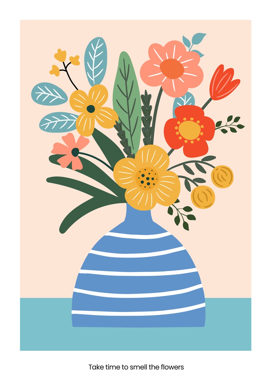 Bold blooms in a striped vase remind us to pause and enjoy life's simple joys. 'Take time to smell the flowers'.
