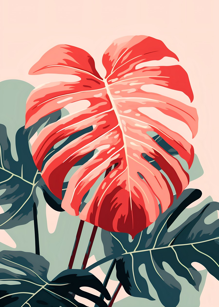 A striking red monstera leaf stands out in this pop art botanical print—bold, vibrant, and full of tropical energy.