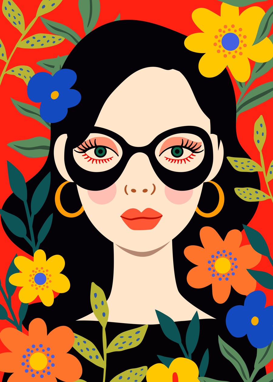 A bold, modern woman with glasses surrounded by vibrant flowers—pop art meets botanical charm in striking color.