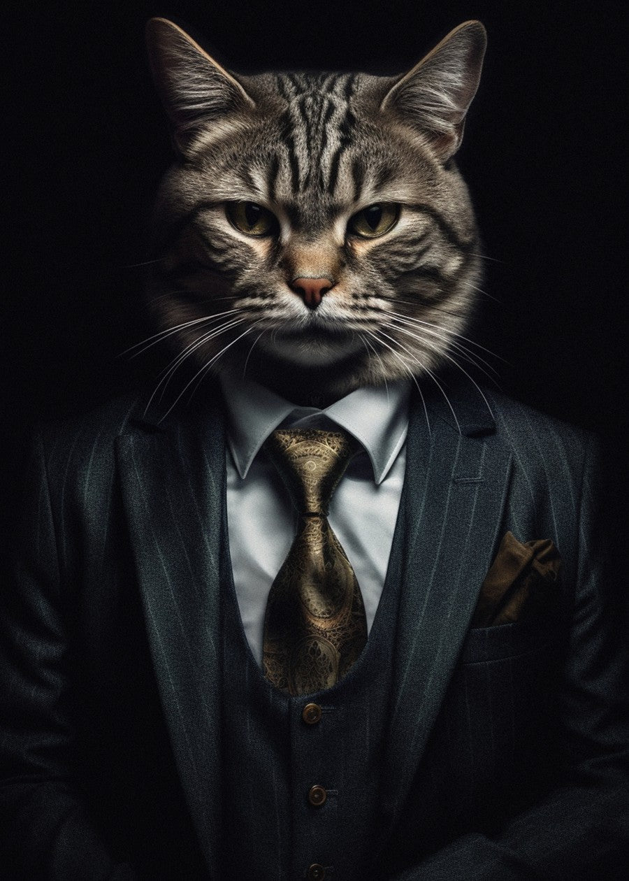 A sharp, detailed portrait of a tabby cat wearing a pinstripe suit, vest, and silk tie.