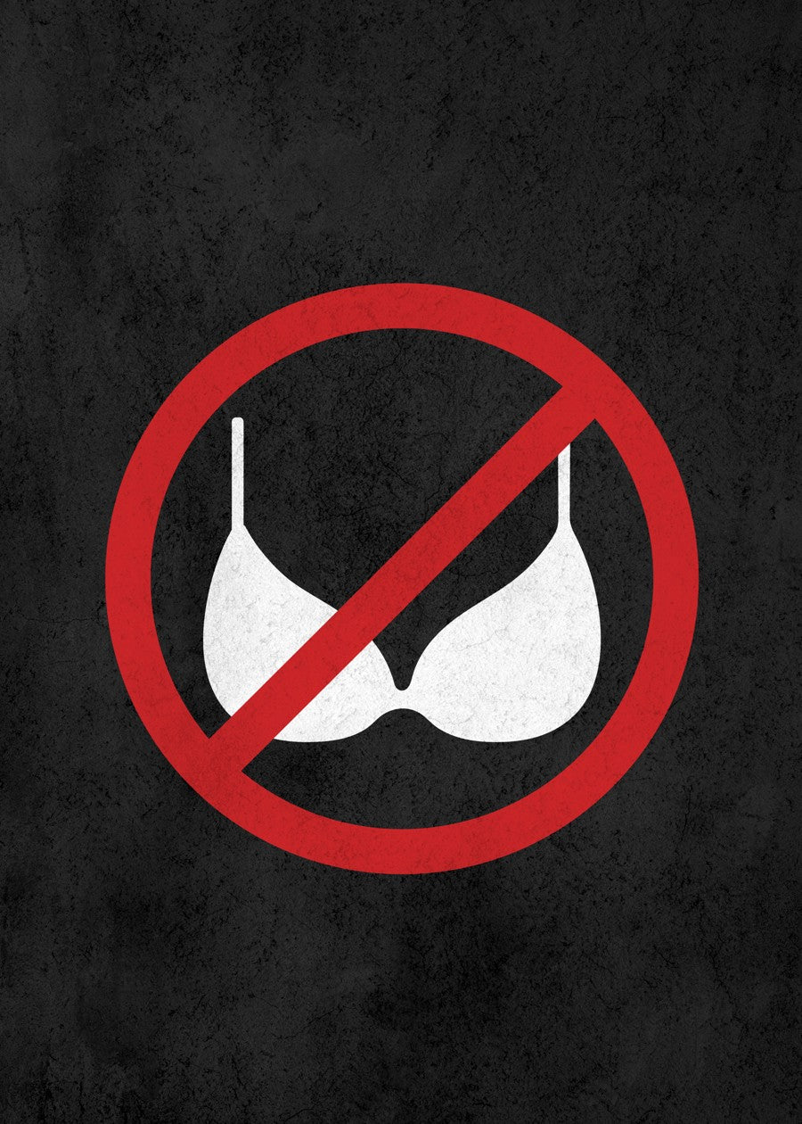 A bold, graphic symbol against a dark background, featuring a white bra inside a red circle and slash. A strong visual for freedom and prote