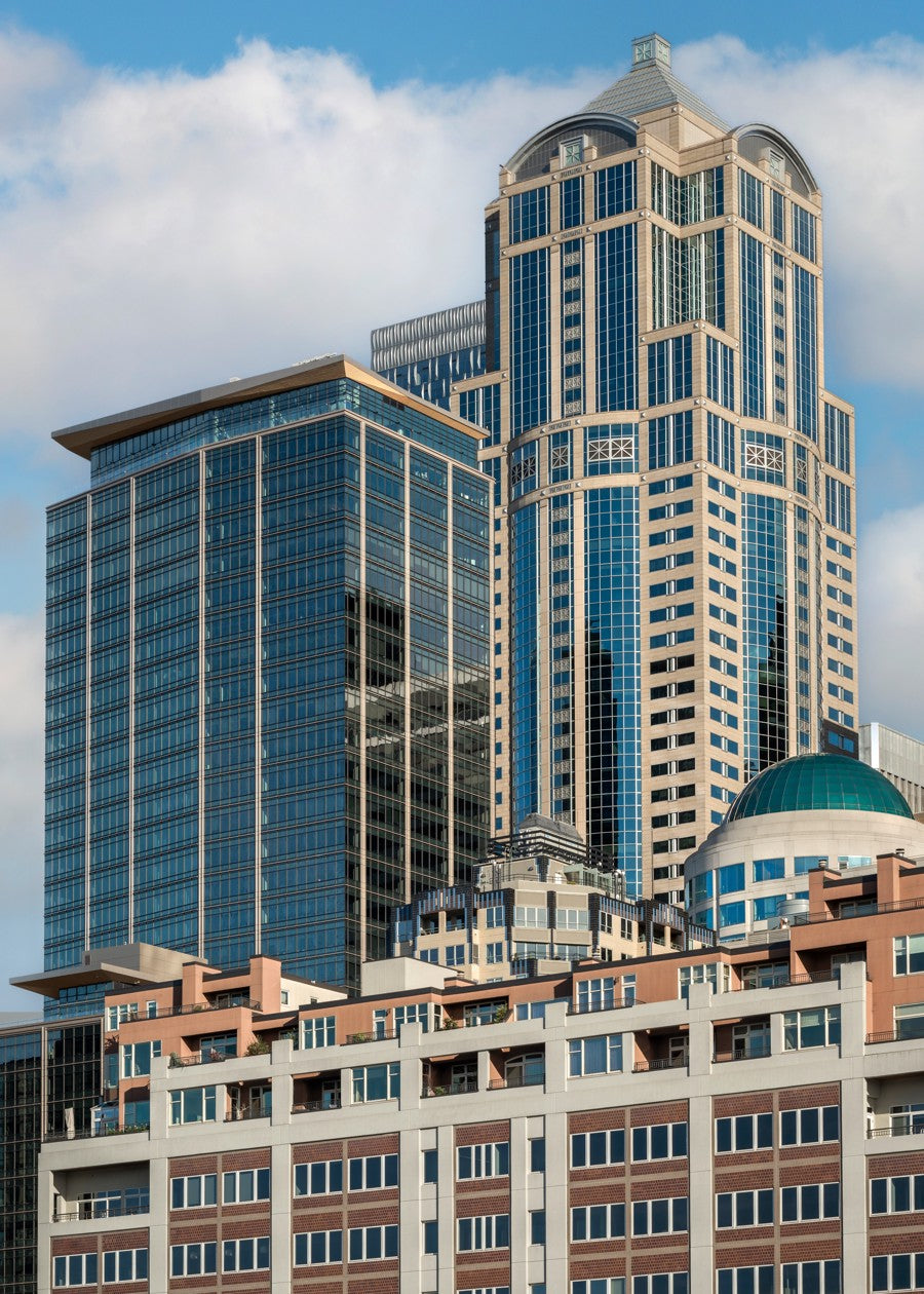 A remarkable example of Seattle's architecture, with blue glass windows and a commanding presence, creating a perfect contrast.