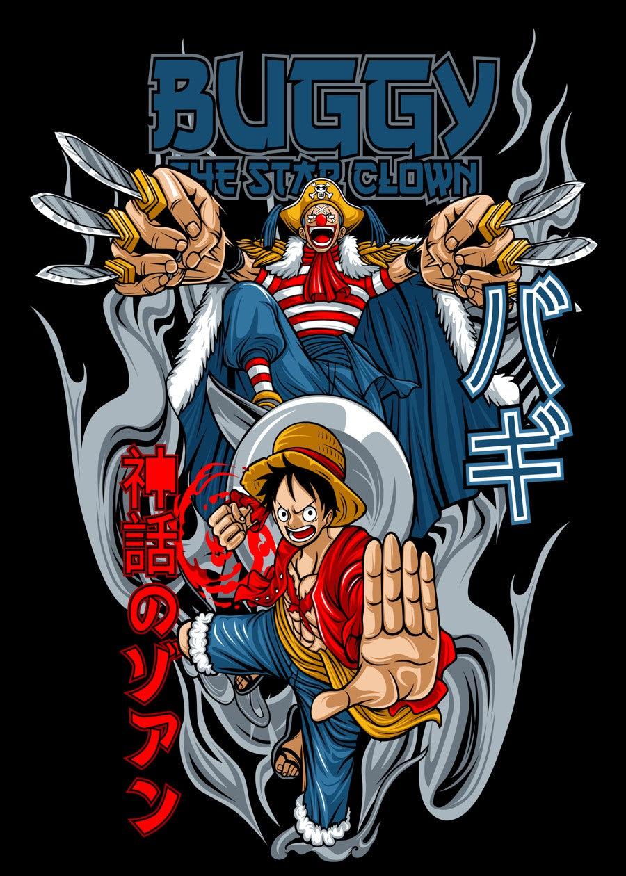 Clown prince Buggy clashes with Luffy in this chaotic, sharp-edged One Piece showdown.