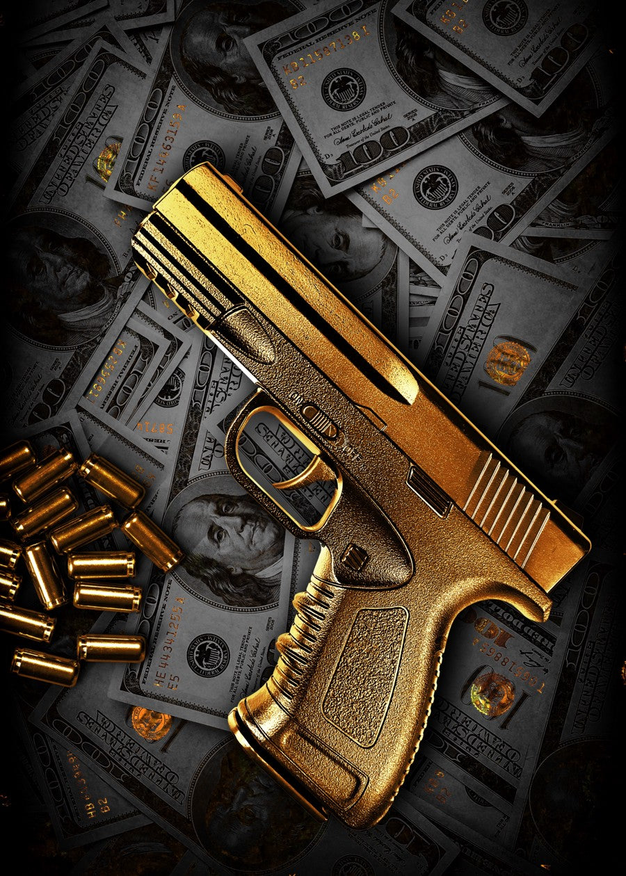 A solid gold pistol and scattered bullets rest on a monochrome background of hundred-dollar bills, symbolizing wealth, status, and control.