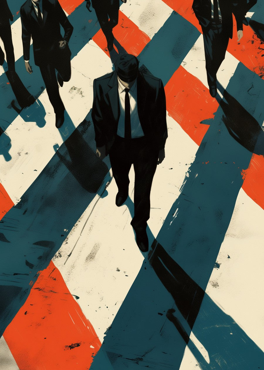 The image shows a group of businessmen walking on a ground with a pattern of alternating red, white, and blue diamonds.