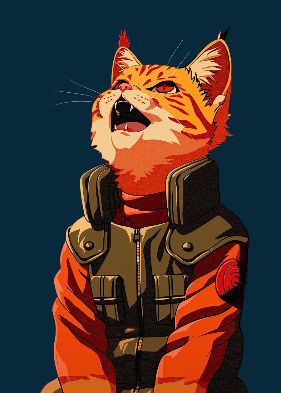 An intense, orange tabby cat dressed as Naruto, with spiky fur and red eyes, looking up with a fierce expression.
