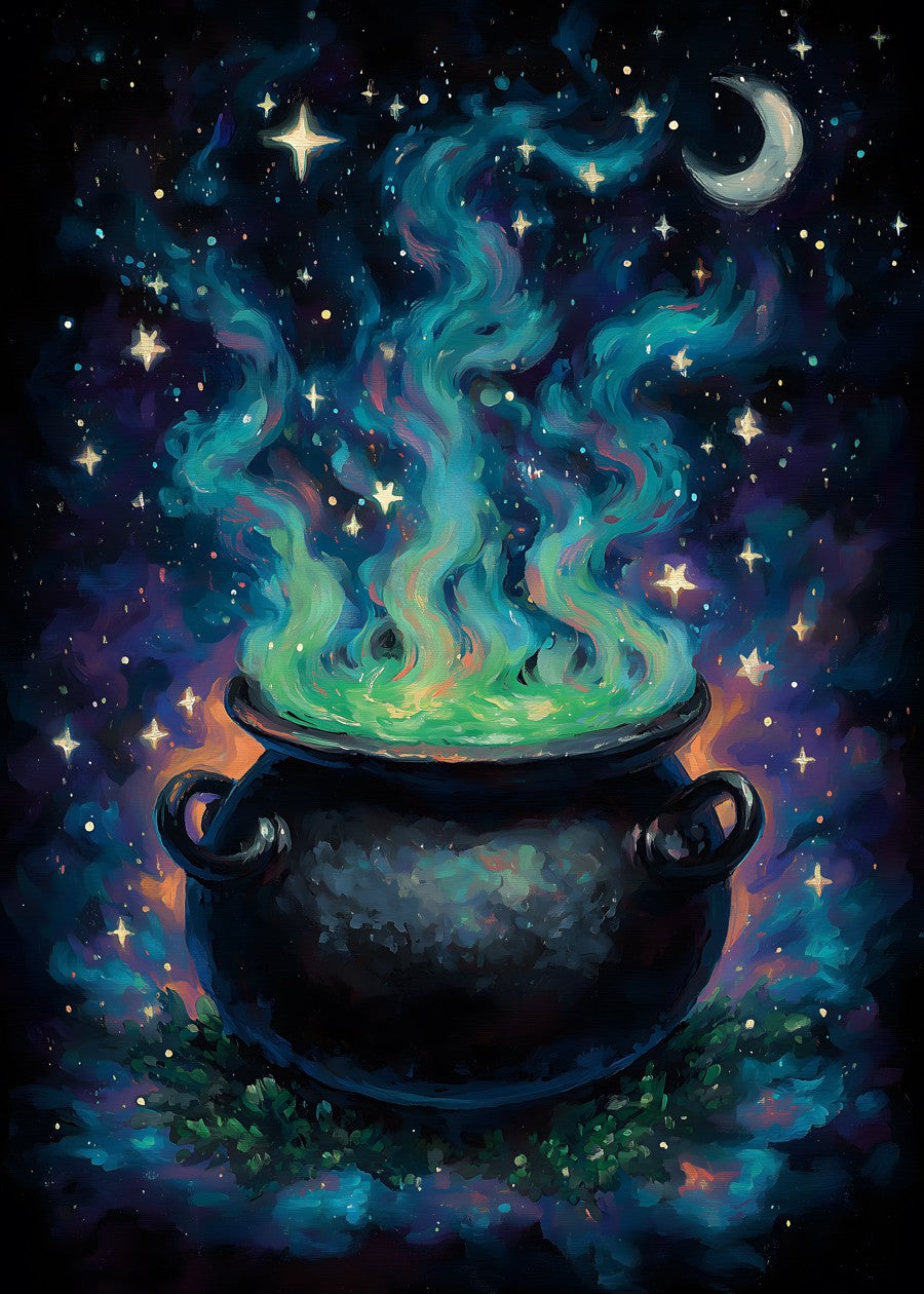 A mystical cauldron bubbles beneath a starlit sky with swirling magic.