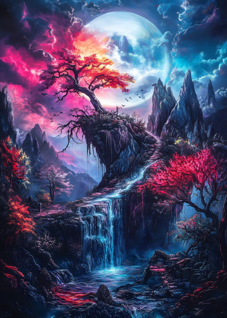 A surreal landscape with vibrant trees under a luminous moon.