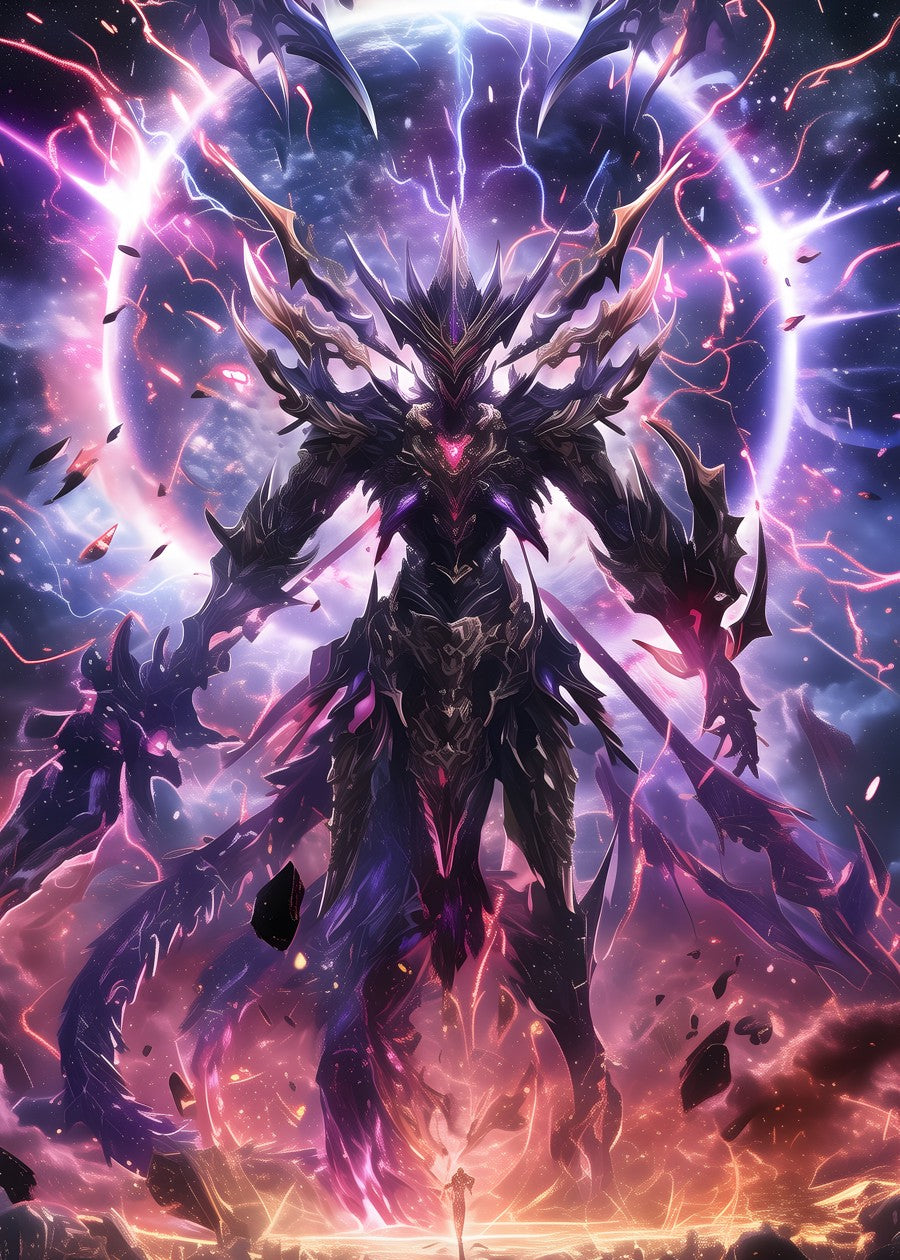 A towering armored being looms, radiating cosmic energy under a swirling nebula.
