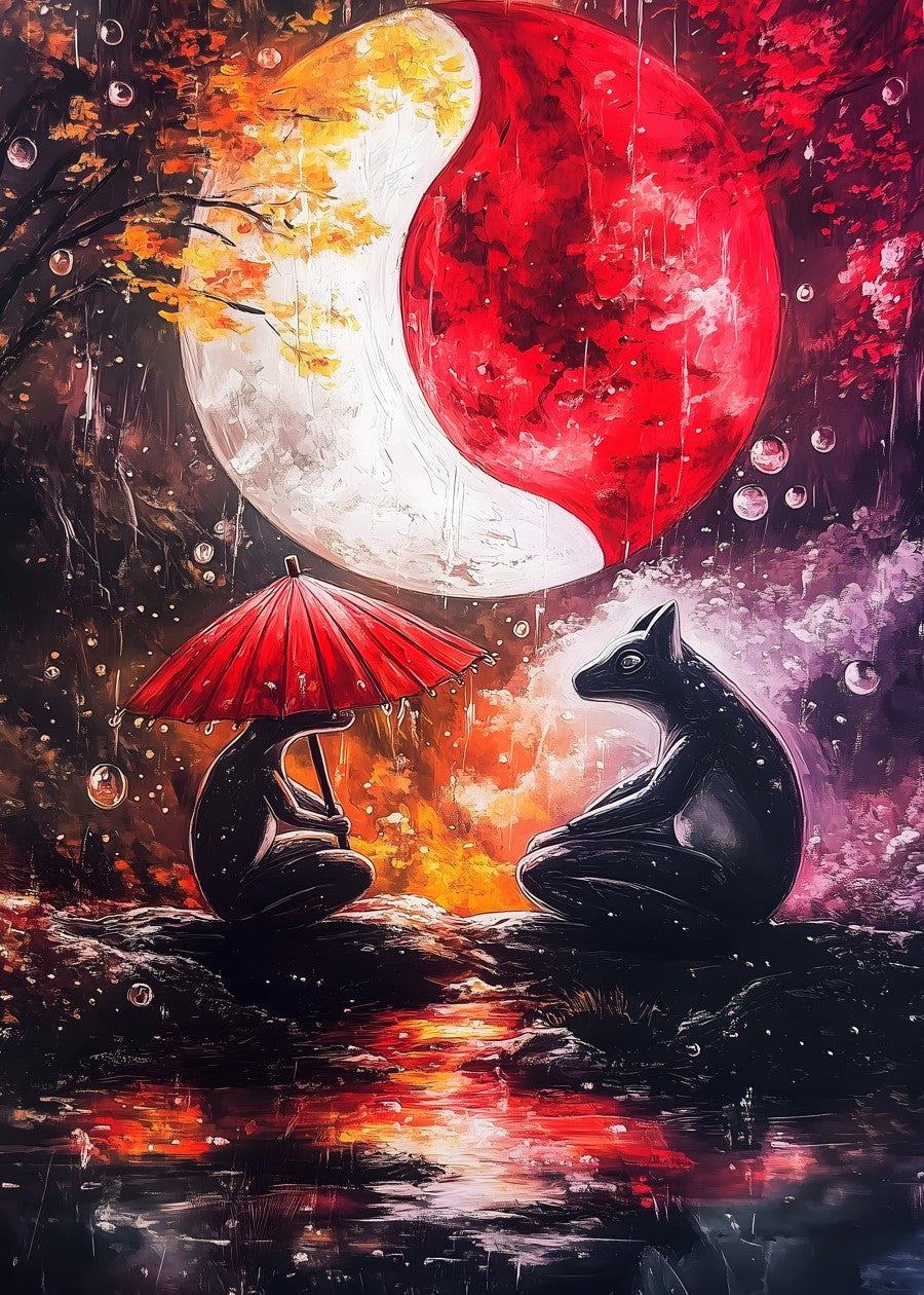 Two mystical figures connect beneath a vibrant, cosmic sky.