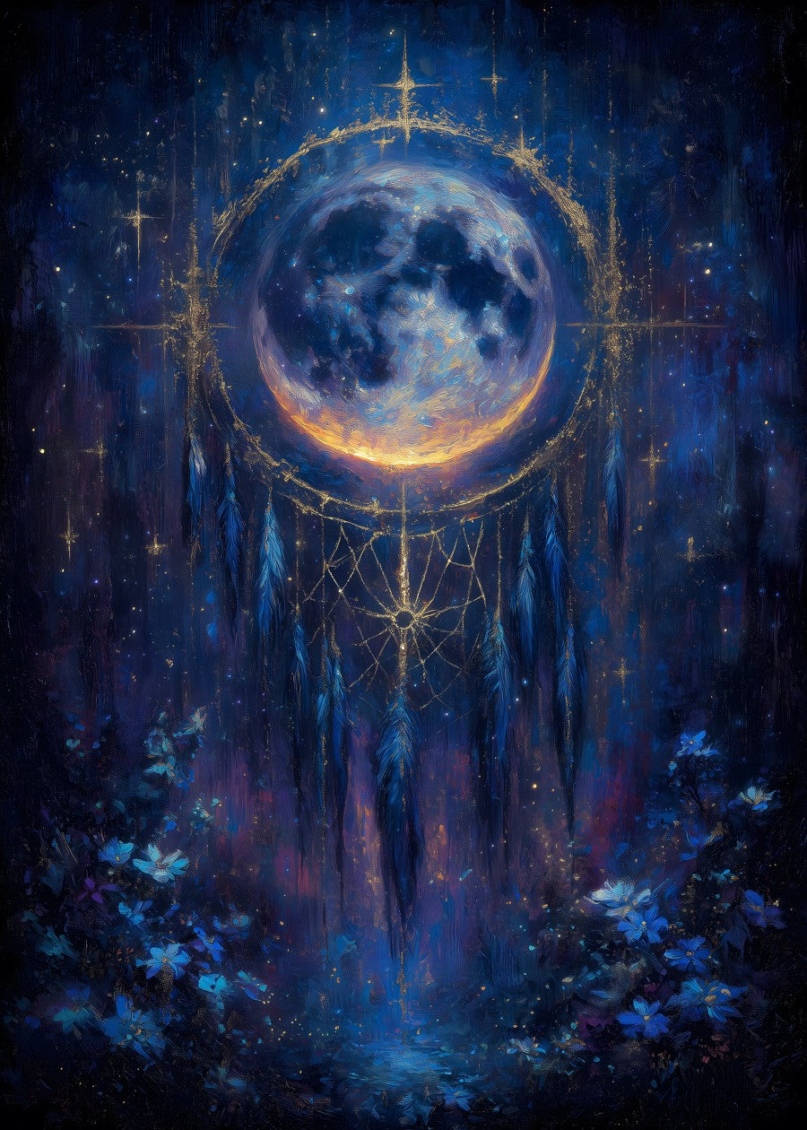 A mystical dreamcatcher cradles the moon amidst a starry, ethereal night.