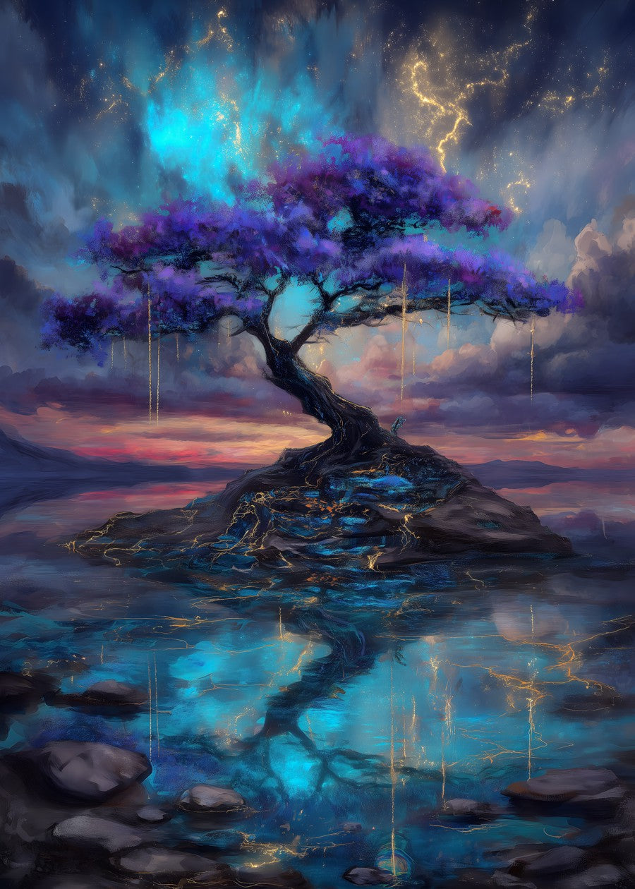 A mystical tree stands amidst glowing waters beneath ethereal skies.