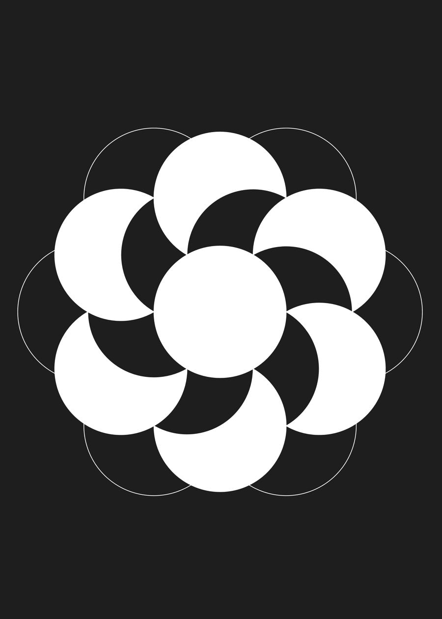 A captivating black and white design inspired by crop circles, blending a geometric flower with celestial moon phases.