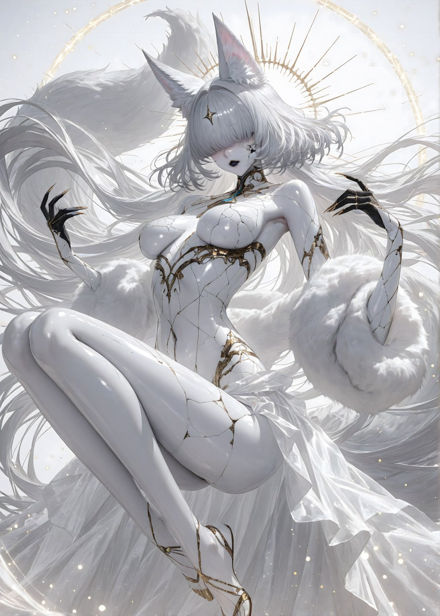 Enigmatic fox spirit adorned with celestial patterns, gracefully floating in an ethereal realm.