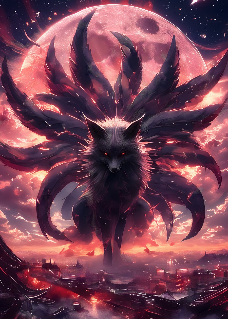 A mystical fox with multiple tails stands against a fiery red moonlit sky.