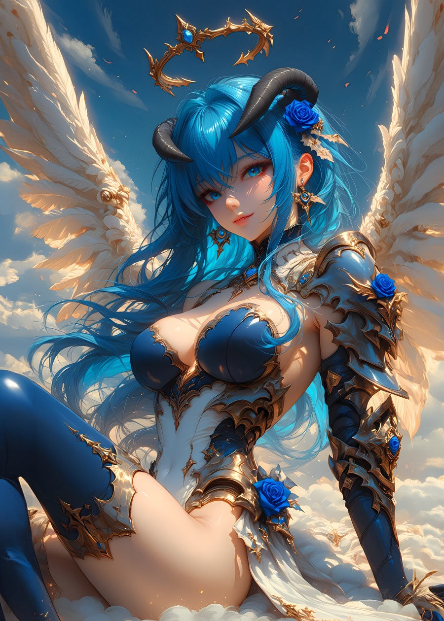 A mystical winged figure with vibrant blue hair, resting among the clouds.