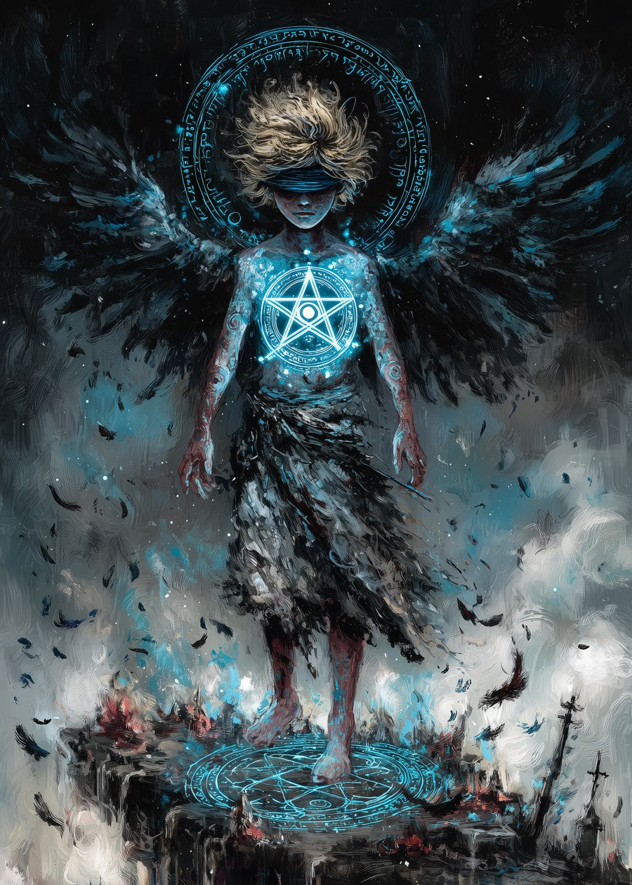 A mystical figure stands amidst swirling magic, bathed in ethereal blue light.