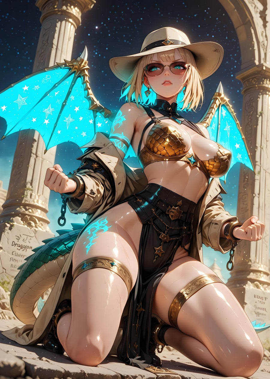 A mystical figure with glowing wings amidst ancient ruins, embodying magic and mystery.