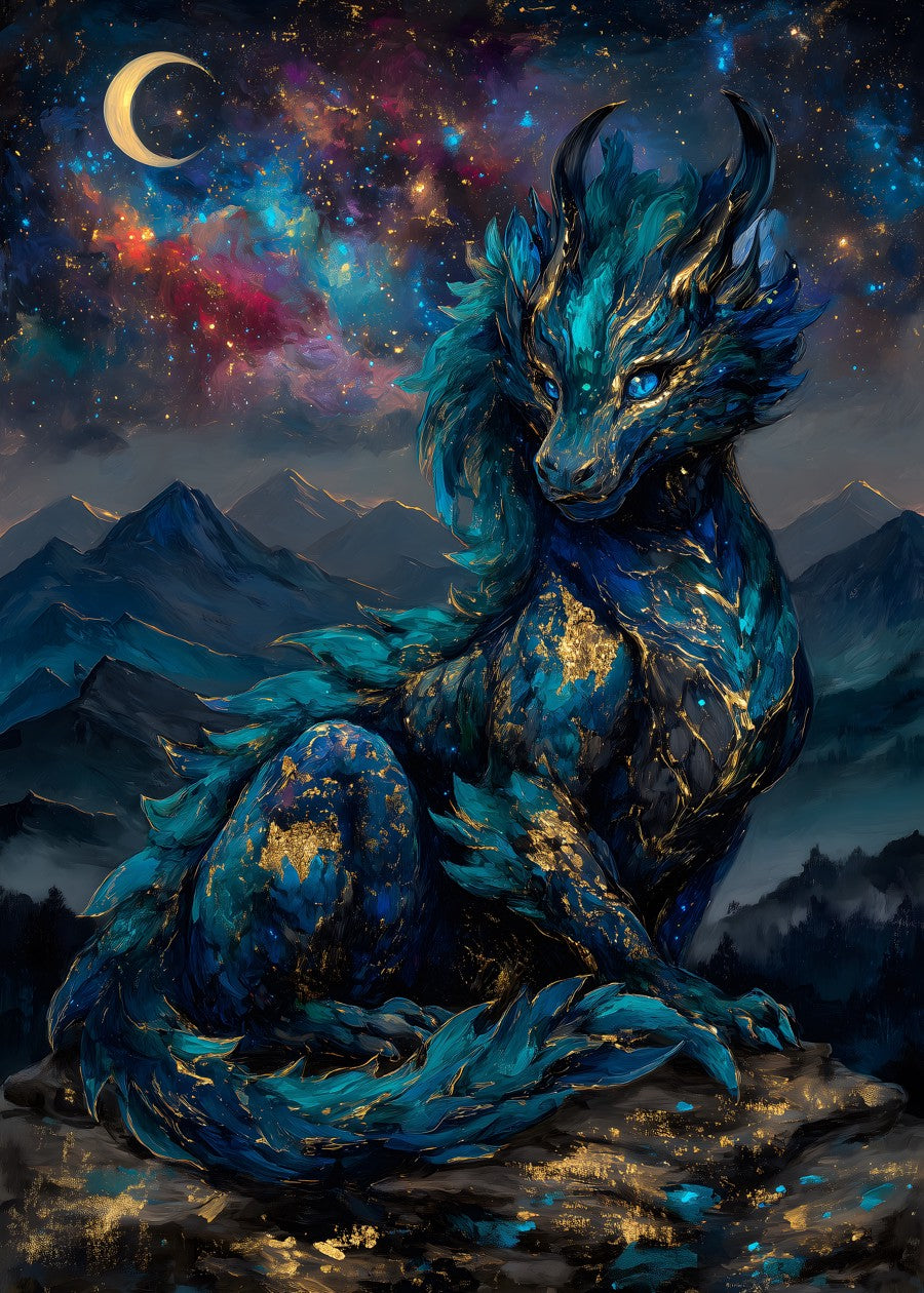 A majestic dragon under a starlit sky, blending with cosmic colors.