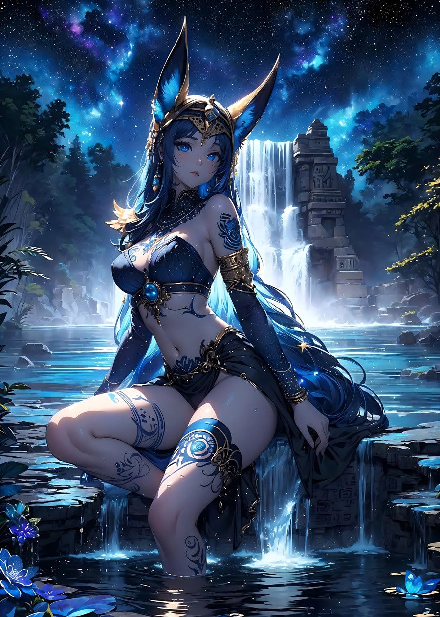 A mystical figure with fox ears guards an ancient waterfall under a starlit sky.