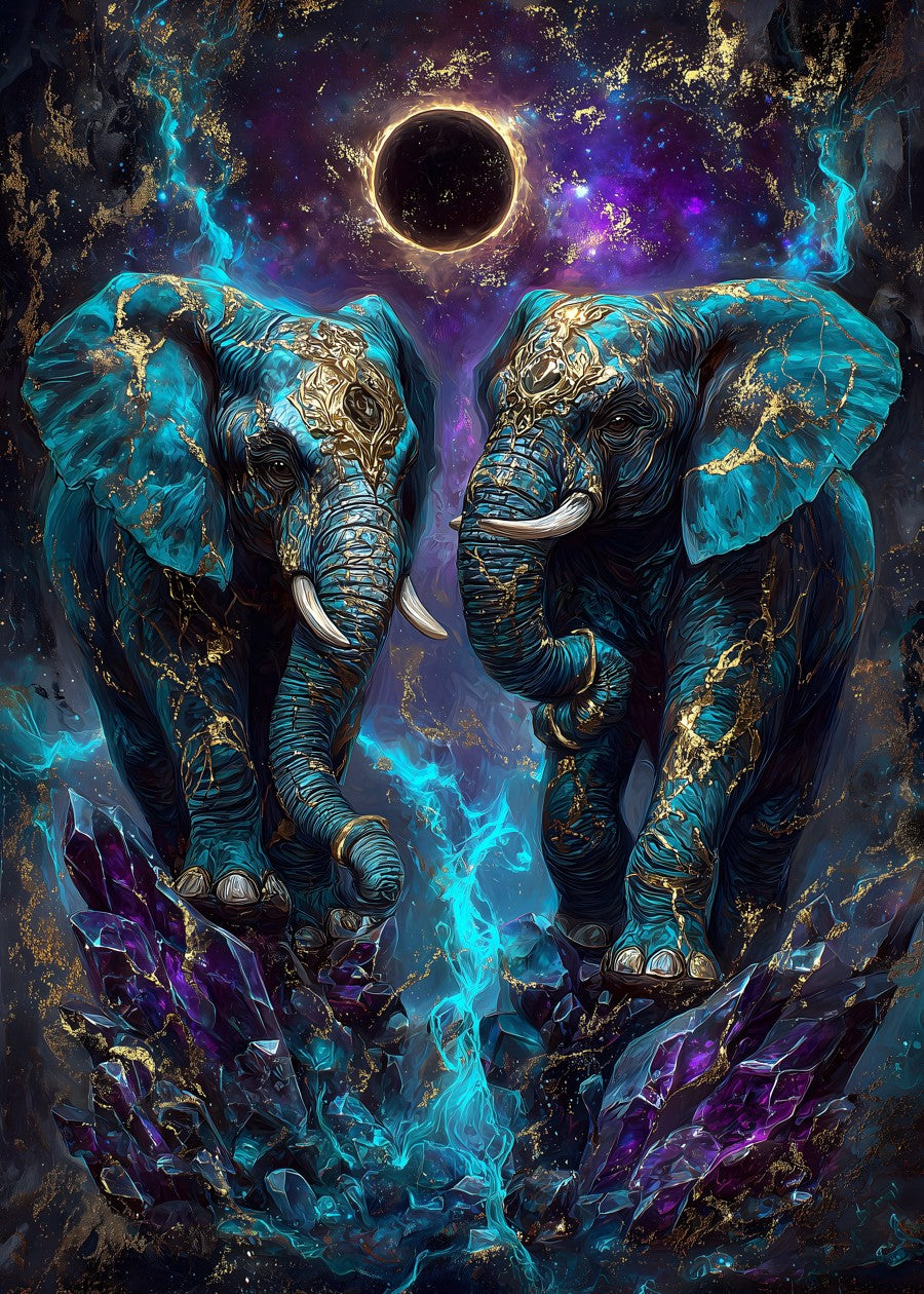 Two majestic elephants adorned with cosmic patterns beneath a mystical eclipse.