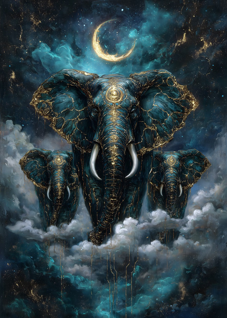 Majestic elephants emerge from cosmic clouds beneath a crescent moon.