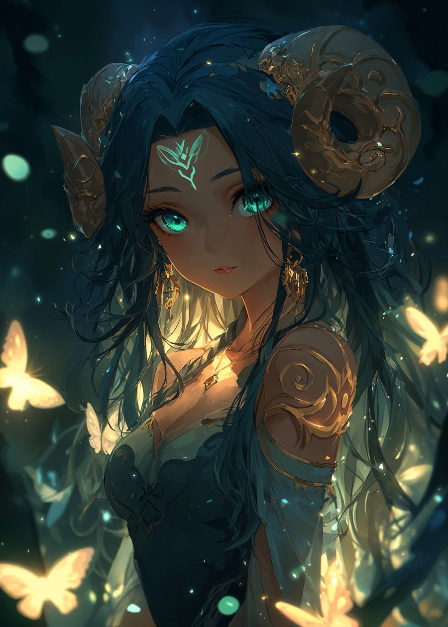 Mystic anime girl with glowing eyes and golden horns, surrounded by luminous butterflies in an enchanted forest night.