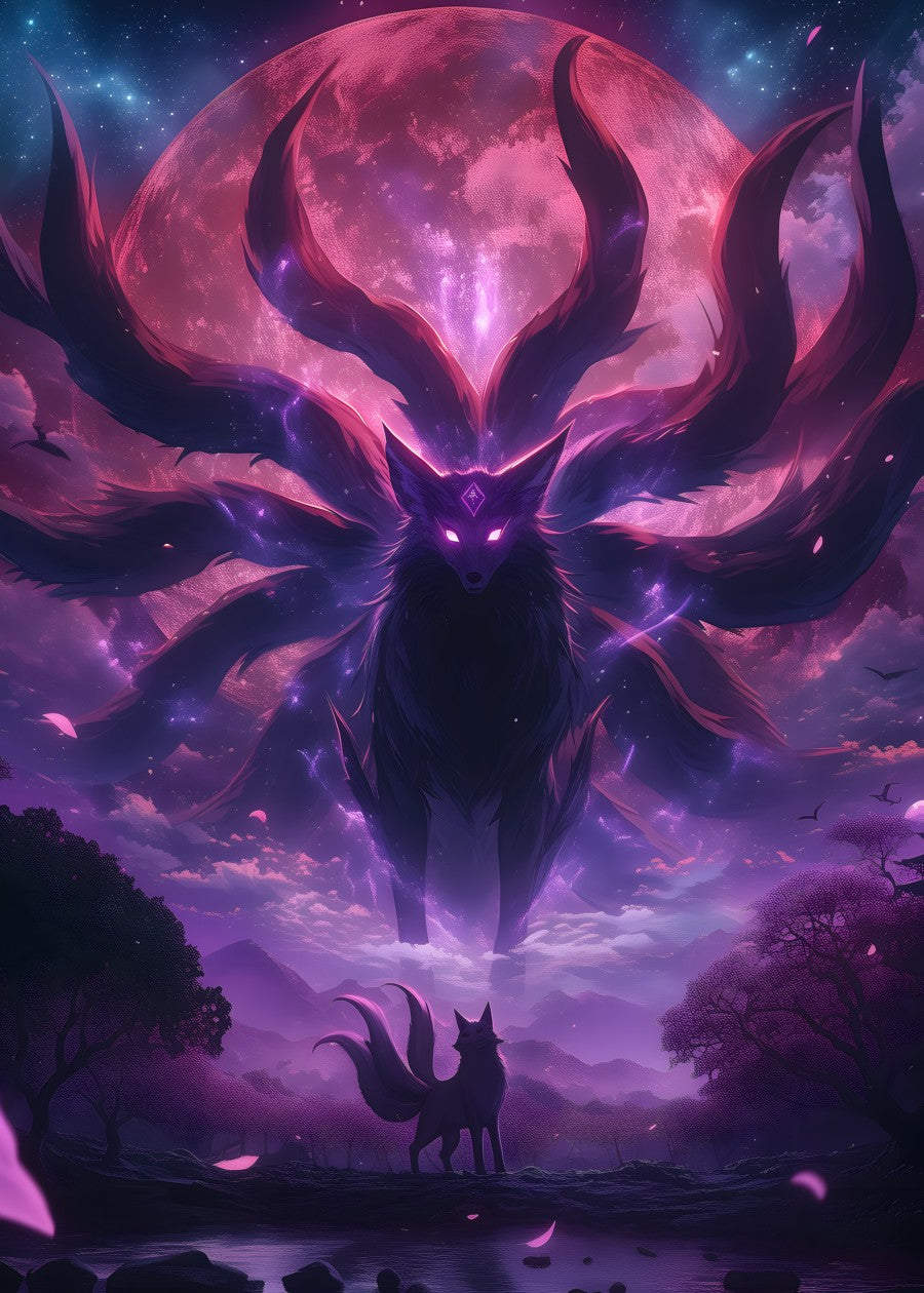 Mystical nine-tailed fox under a cosmic sky, glowing with ethereal energy.