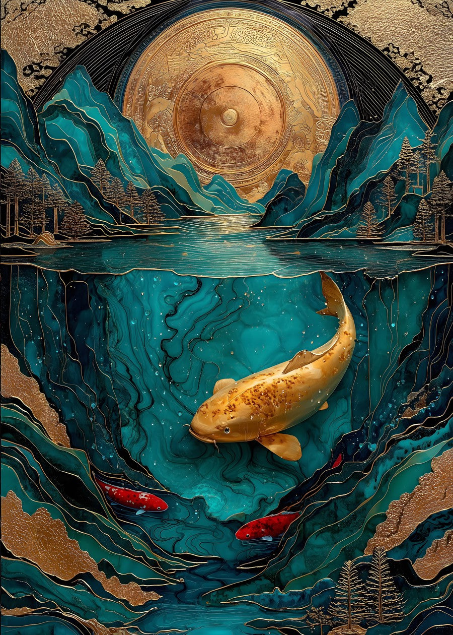 A mystical landscape intertwines with celestial koi under a radiant golden sun.