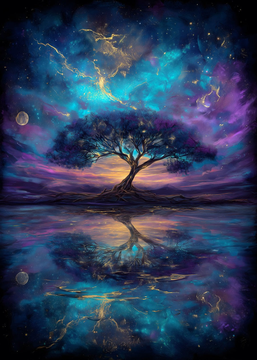 A mystical tree reflects in a cosmic sky of vibrant blues and purples.