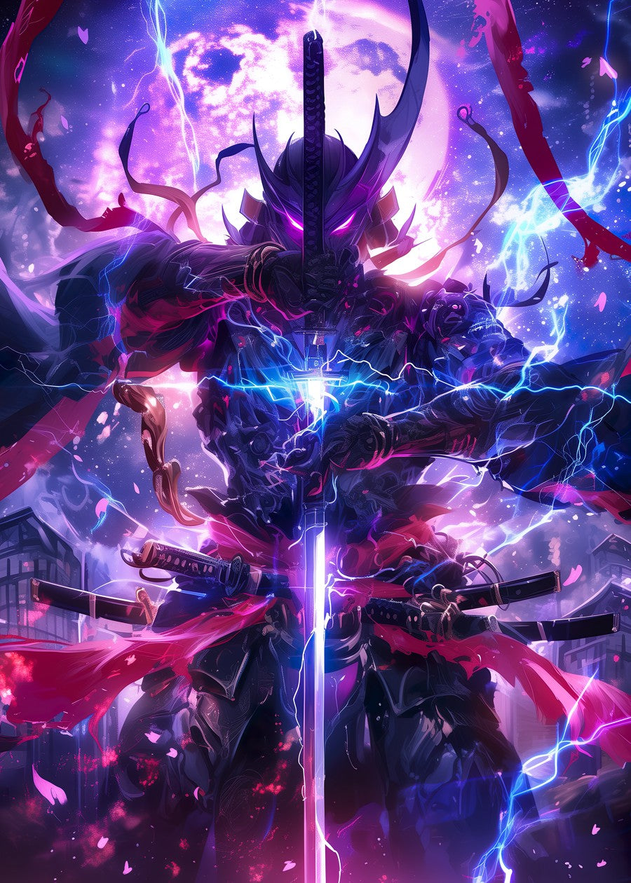 An armored samurai channels mystical energy, sword glowing under an ethereal sky.