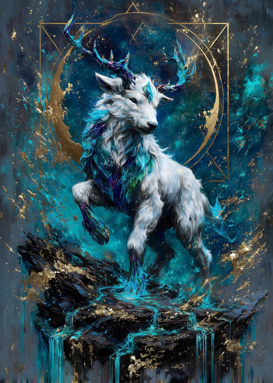 A mystical stag emerges in vibrant colors, surrounded by celestial patterns and ethereal light.