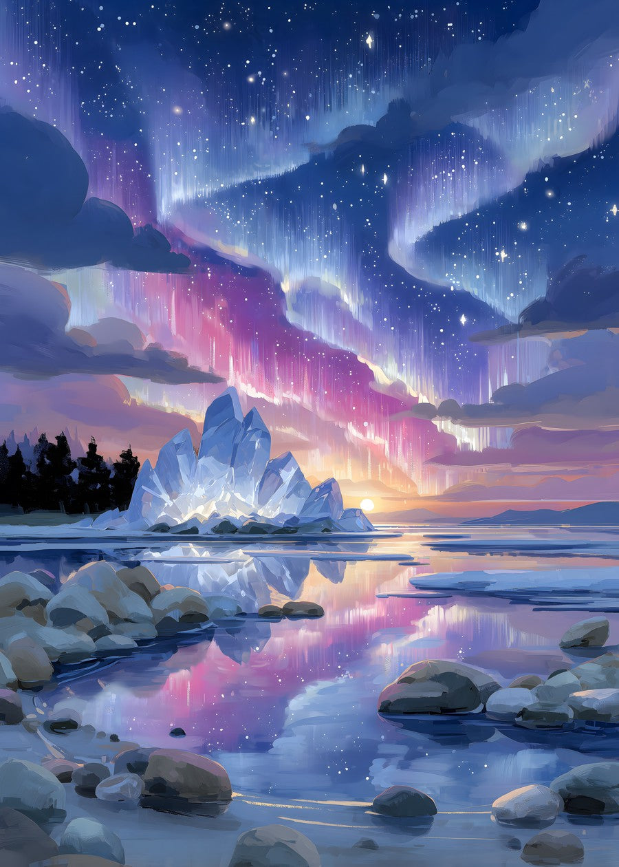 Shimmering aurora over icy landscapes reflects a cosmic dance in the night sky.