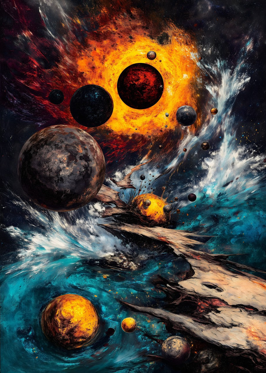 Vibrant cosmic dance of planets and fiery colors in a chaotic universe.