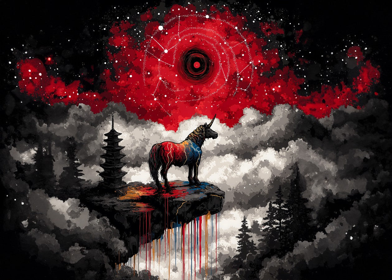 A unicorn stands on a cliff beneath a cosmic red sky filled with stars.