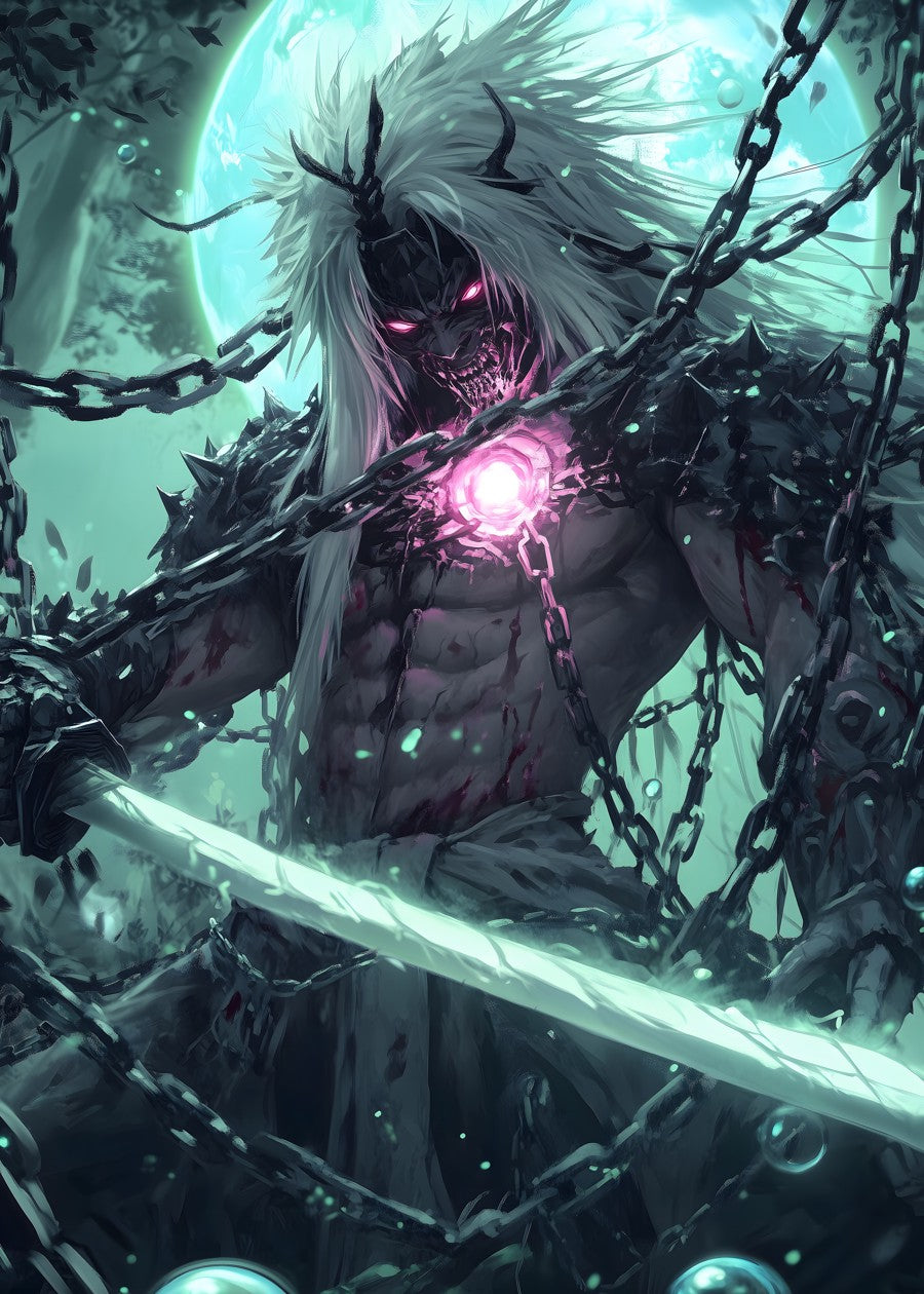 A chained warrior radiating energy in a mystical, moonlit forest.