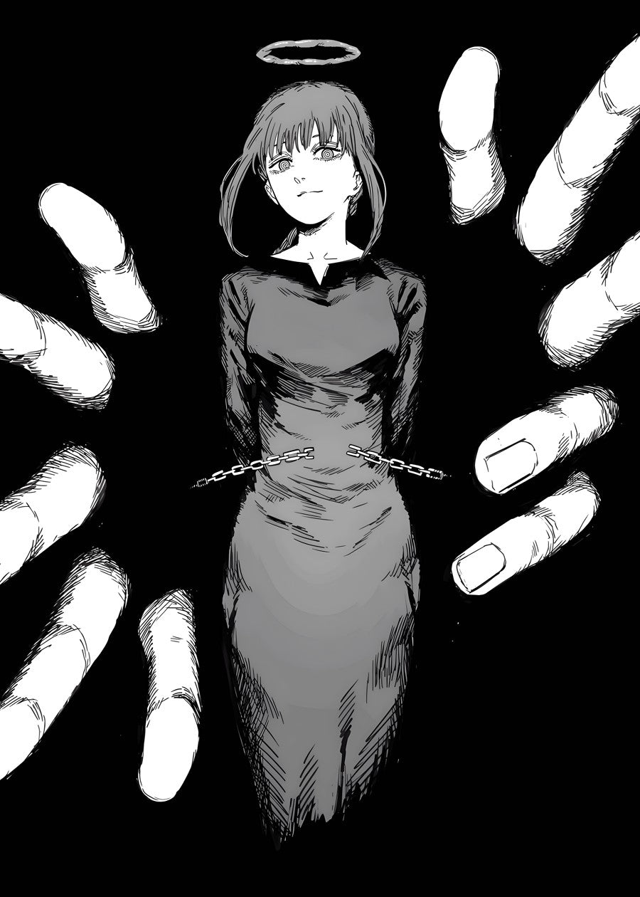 Mysterious girl with a halo, chained and surrounded by ghostly hands. Haunting and symbolic scene.