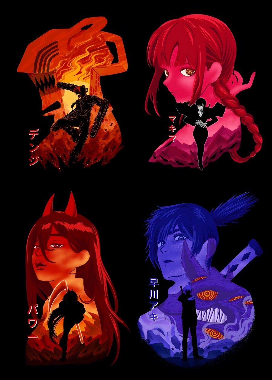 Chainsaw Man cast in moody, vibrant colors—Denji, Power, Aki, and Makima captured in split scenes.