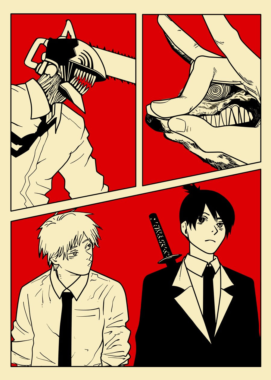 Designed as a series of bold manga panels, this artwork incorporates Denji, Aki, the Fox Devil summon, and a fierce Chainsaw Man depiction.