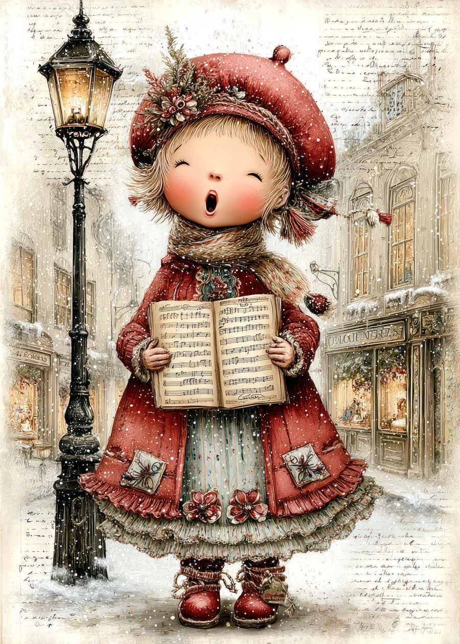 A young girl in a bright red coat sings carols while holding a sheet of music in her hands. Snow gently falls around her on a vintage street.