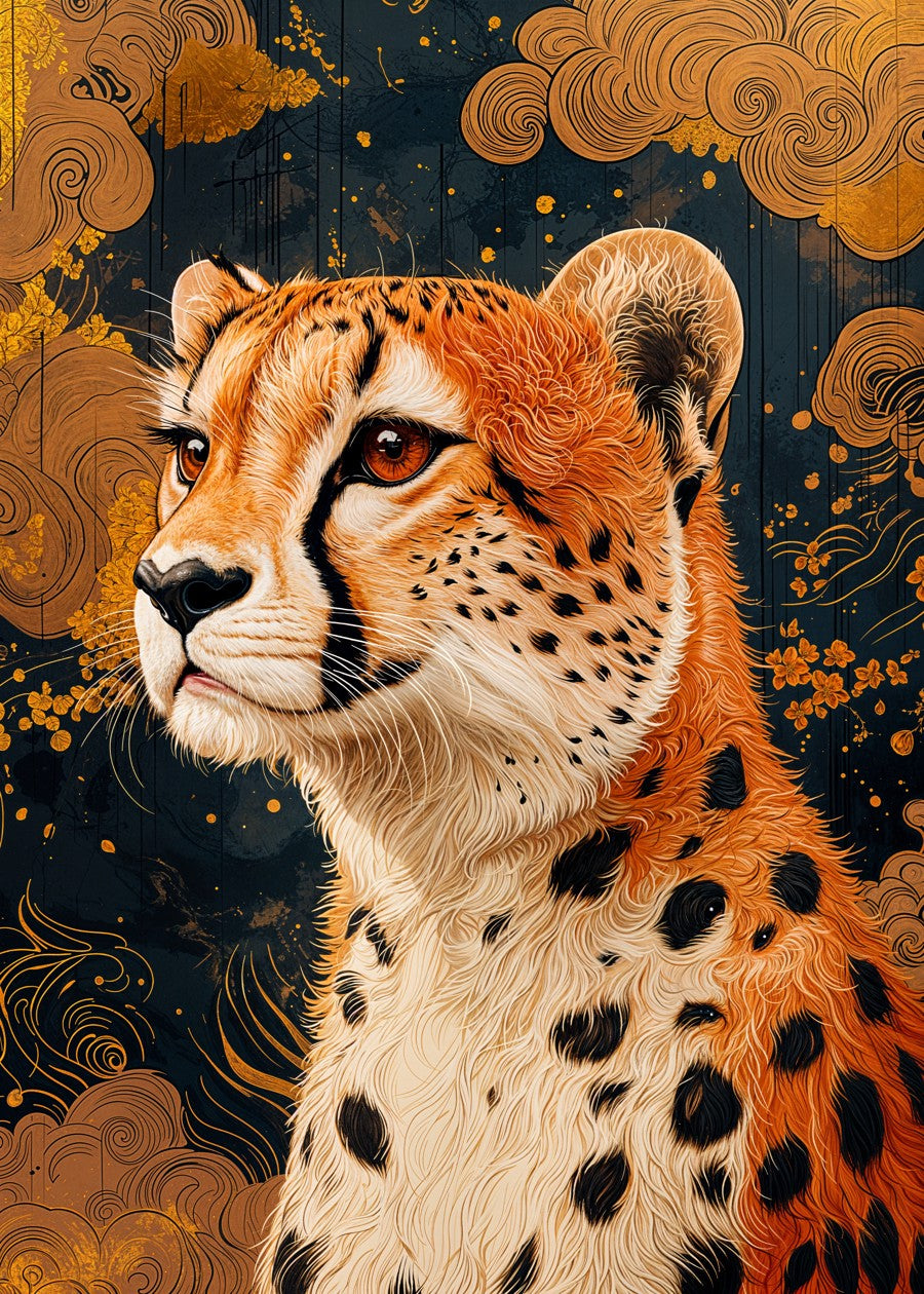 A majestic cheetah emerges from golden clouds, blending wild elegance and fantasy in a refined Japanese-inspired art style.