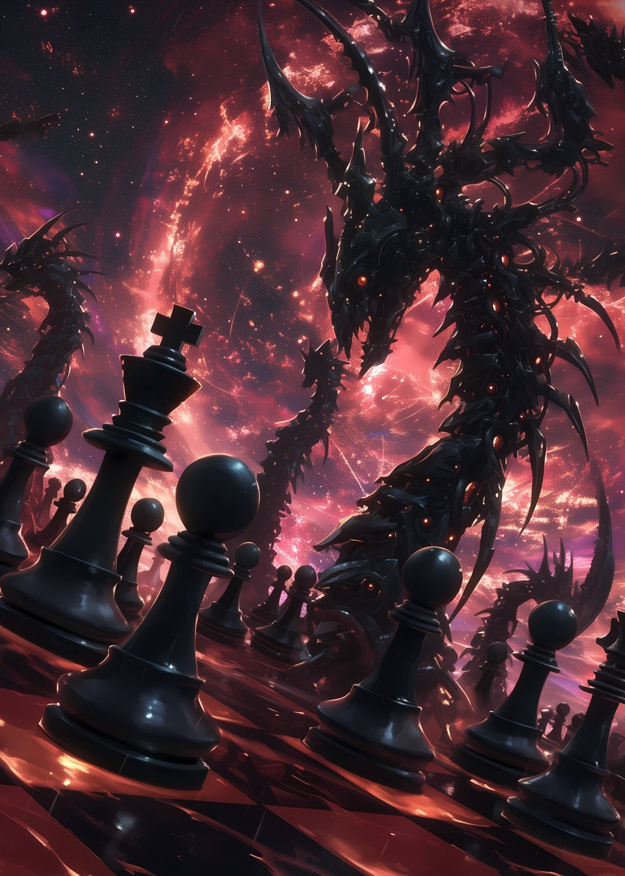 Galactic chess under the gaze of cosmic dragons, amidst an interstellar storm.
