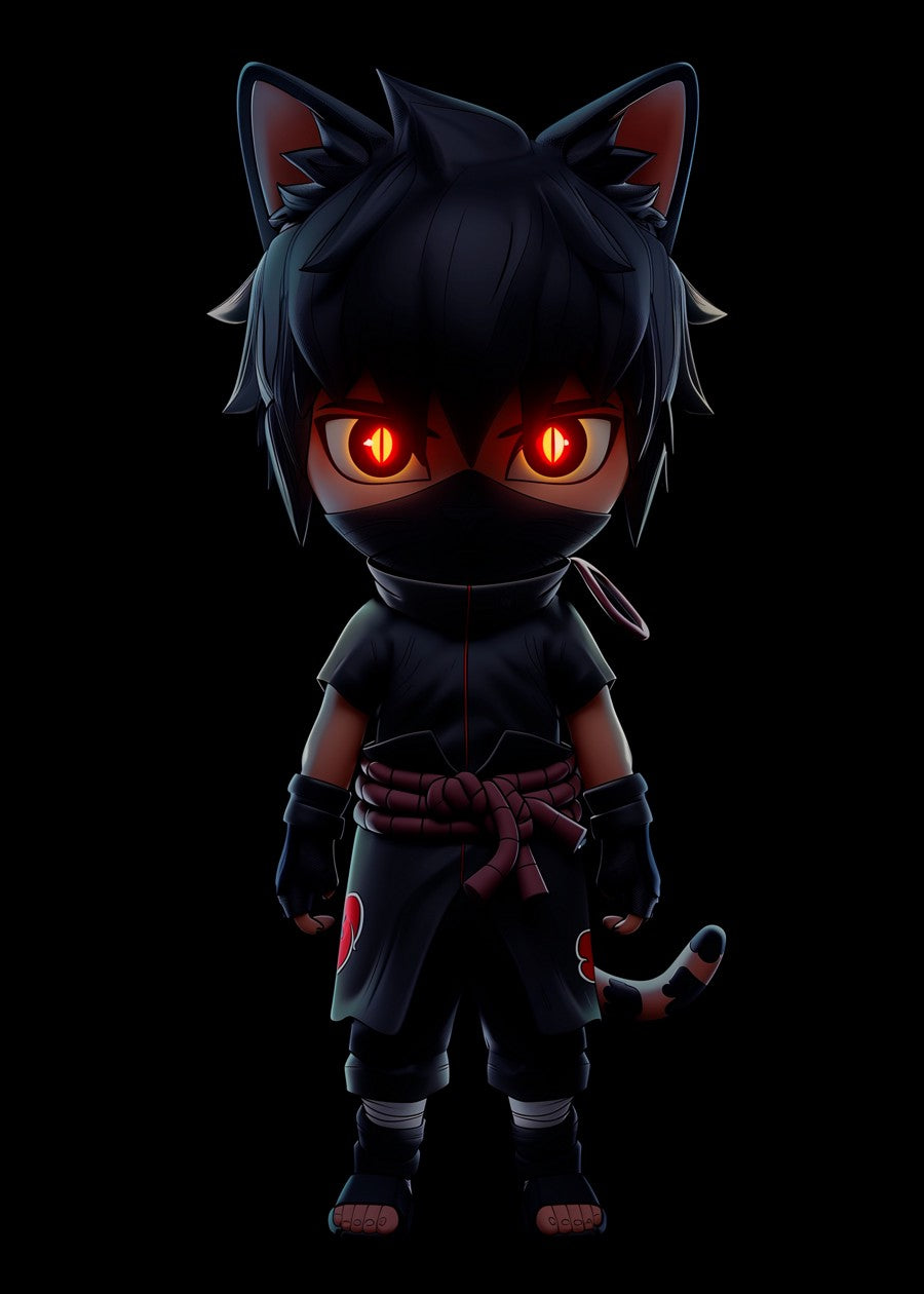 A fierce chibi ninja with cat ears and a mask, resembling Sasuke Uchiha from Naruto, with glowing red eyes and the Uchiha crest.